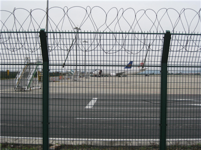 機場護欄網又稱作Y型安詳防止護網,鐵路護欄網,是由V型支架立柱增強型焊接片網,安詳防盜毗連件和熱鍍鋅刀片刺網構成強度和安詳防止性級別很高。被遍及應用在機場,軍事基地等高安詳場合。