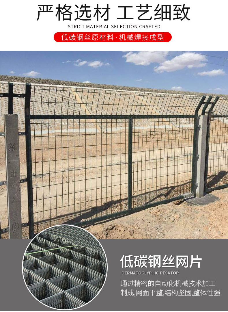 高速公路隔離柵是一種具有耐腐蝕、抗老化、耐酸堿、表面平整、光亮、手感舒適等優點的防護網產品,并且安裝簡便,美觀大方,各種顏色的隔離網裝點出一個多彩的世界。高速公路隔離網采用低碳鋼絲、鋁鎂合金絲,噴塑,編織焊接而成,網格結構簡練、便于運輸、安裝不受地形起伏限制,對于山地、坡地、多彎地帶適應性特強,具有其他結構隔離柵無法比擬的優點。高速公路隔離網一般產品規格:1、浸塑絲經 4.5--5.5mm2、網孔