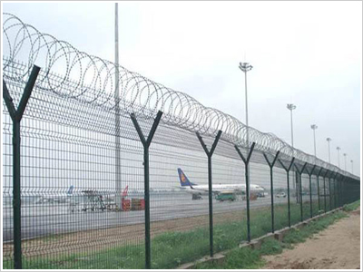 17832289222機場隔離網又稱作“Y型安全防御護網”,是由V型支架立柱加強型焊接片網,安全防盜連接件和熱鍍鋅刀片刺網組成強度和安全防御性級別很高。被廣泛應用在機場,軍事基地等高安全場所。